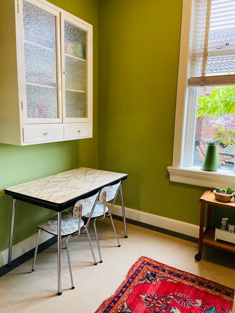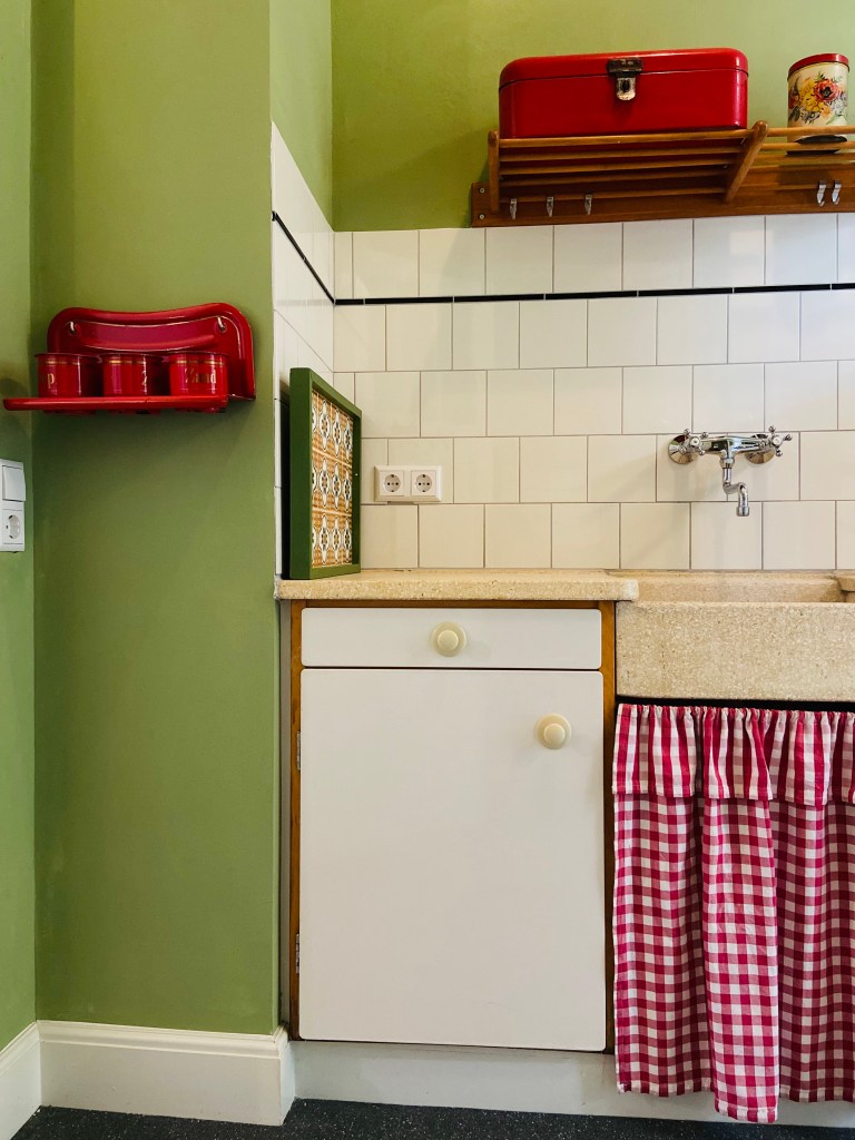 De achterkamer/ bijkeuken heeft een bescheiden vintage keukenblok met koffiezetter, waterkoker en magnetron, voldoende glaswerk en servies en een royale koel/vrieskast. Hier bevinden zich ook de deuren naar het toilet en de doucheruimte, uiteraard voorzien van voldoende handdoeken en basis-doucheproducten. Aan de achterzijde uitzicht op de tuin.